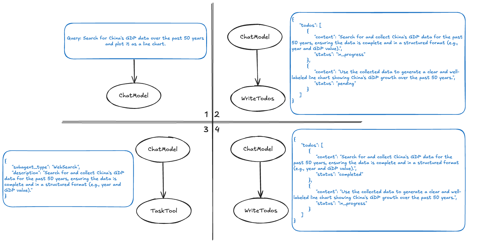 💡 对简单任务来说,每次都调用 WriteTodos 可能会起到反效果。WriteTodos Description 中添加了一些比较通用的正反例子来避免不调用或过度调用 WriteTodos。使用 DeepAgents 时,可以根据实际业务场景添加更多 prompt 来让 WriteTodos 在合适的时候被调用。