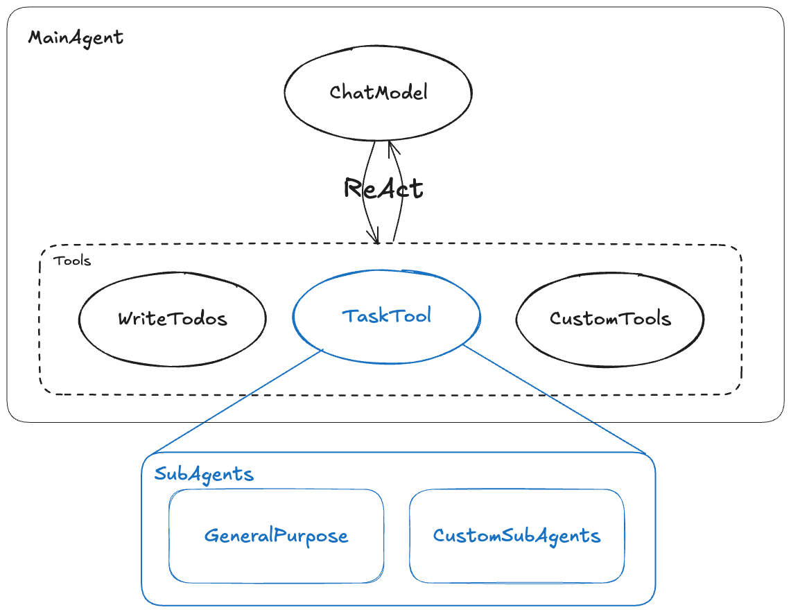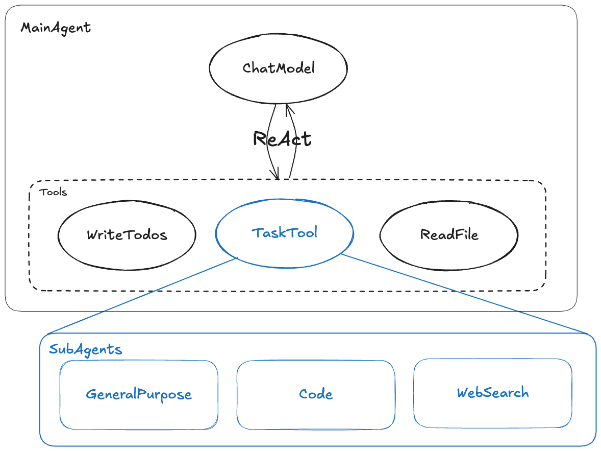 DeepAgents 是一种多智能体(Multi-Agent)架构,其核心思想在于通过一个主代理(MainAgent)来协调、规划和委派任务。主代理本身不直接执行所有操作,而是利用其内置的大模型和一系列工具来与外部世界交互或将复杂任务分解给专门的子代理(SubAgents)。