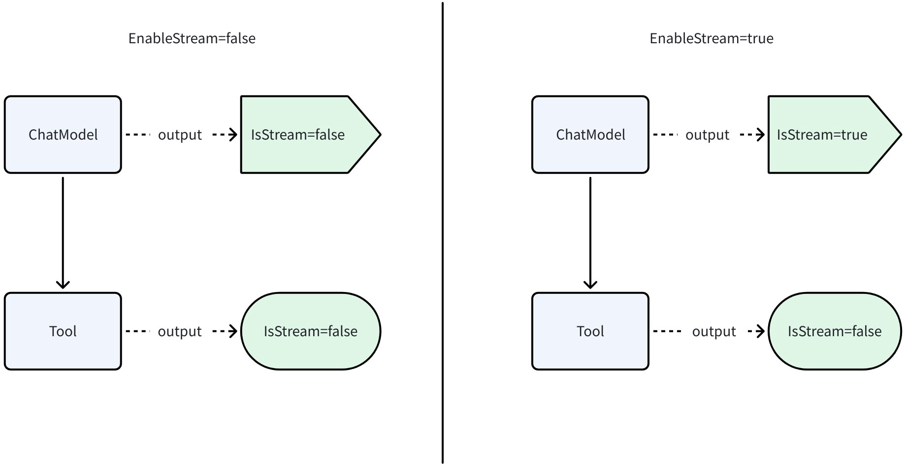 EnableStreaming=true时,对于 Agent 内部能够流式输出的组件(如 ChatModel 调用),应以流的形式逐步返回结果。如果某个组件天然不支持流式,它仍然可以按其原有的非流式方式工作。