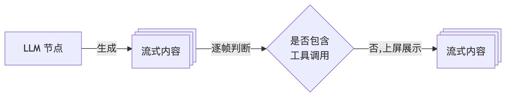 - 运行模式的不匹配:由于是同步运行,所以“为了尽快把 LLM 的回复展示给用户”,要求 ReAct Agent 编排内的各节点都尽量“快”,这主要是“在判断 LLM 的输出是否包含 ToolCall”的分支判断逻辑中,要尽可能根据第一个包或者前几个包完成判断。这个分支判断逻辑可以自定义,比如“读流式输出直到看到 Content,才判断为没有 ToolCall”,但有时并不能完全解决问题,只能通过 Callback 这样的“旁路”手动切换“同步”为“异步”。